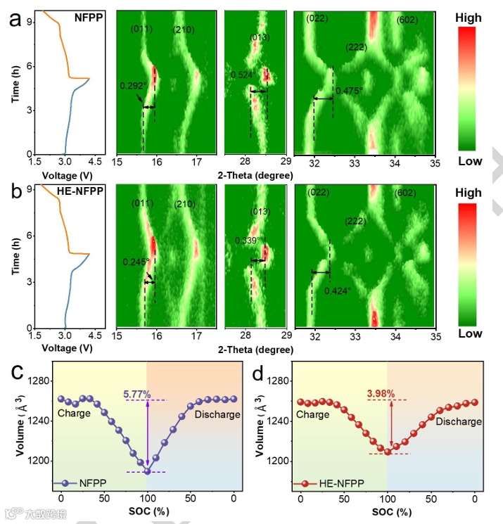图4:描绘了NFPP和HE-NFPP的充/放电过程及原位XRD谱,以及体积变化,进一步证实了HE-NFPP在充放电过程中的结构稳定性。