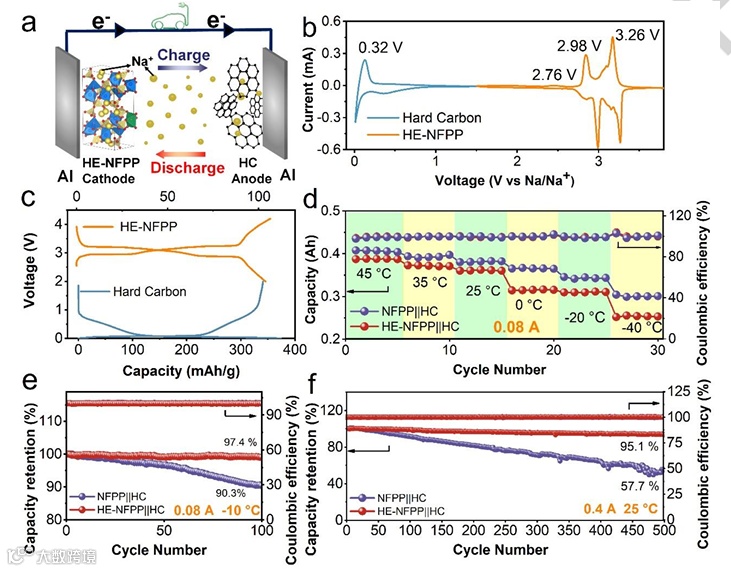 图5:展示了HE-NFPP||HC软包全电池的示意图、循环伏安曲线、充放电曲线、不同温度下的放电容量、-10℃下的循环性能以及25℃下的长期循环性能,证明了HE-NFPP在实际应用中的潜力。
