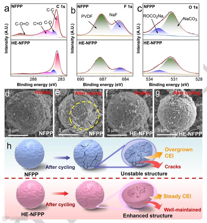 图6:提供了NFPP和HE-NFPP在0.4A下循环500次后的XPS图、SEM图像以及长期循环测试后颗粒的结构稳定性示意图,进一步证实了HE-NFPP的稳定性。