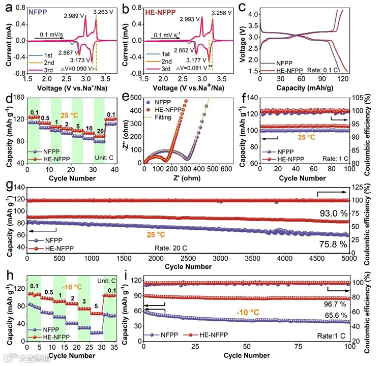 图3:展示了NFPP和HE-NFPP在25℃下的循环伏安曲线、首次充放电曲线、倍率性能、电化学阻抗谱图、循环性能以及20.0C循环性能,证明了HE-NFPP的优异电化学性能。