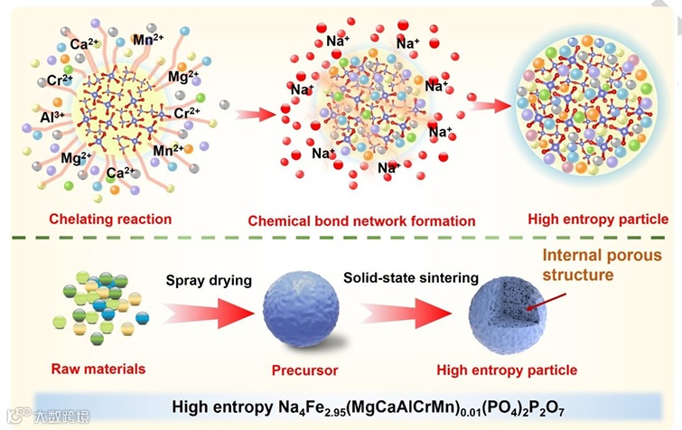创新高熵策略:华南理工大学杨成浩团队通过喷雾干燥和高温烧结技术合成了高熵Na4Fe2.95(MgCaAlCrMn)0.01(PO4)2P2O7 (HE-NFPP)。