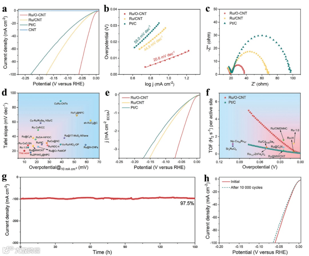 图3:展示了Ru/O-CNT在碱性HER中的卓越性能,包括LSV极化曲线、Tafel曲线和EIS Nyquist图。