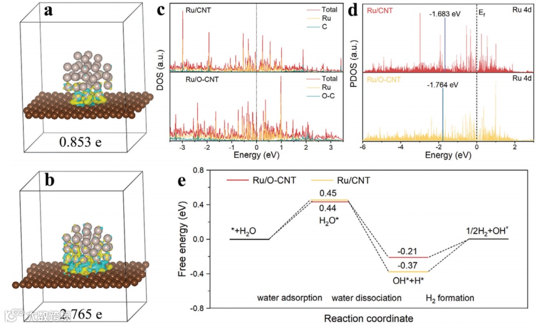 图5:DFT计算分析了Ru/O-CNT与Ru/CNT的电子转移情况,以及Ru d轨道中心位置的变化。
