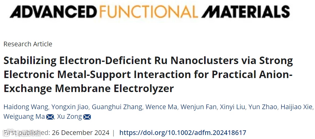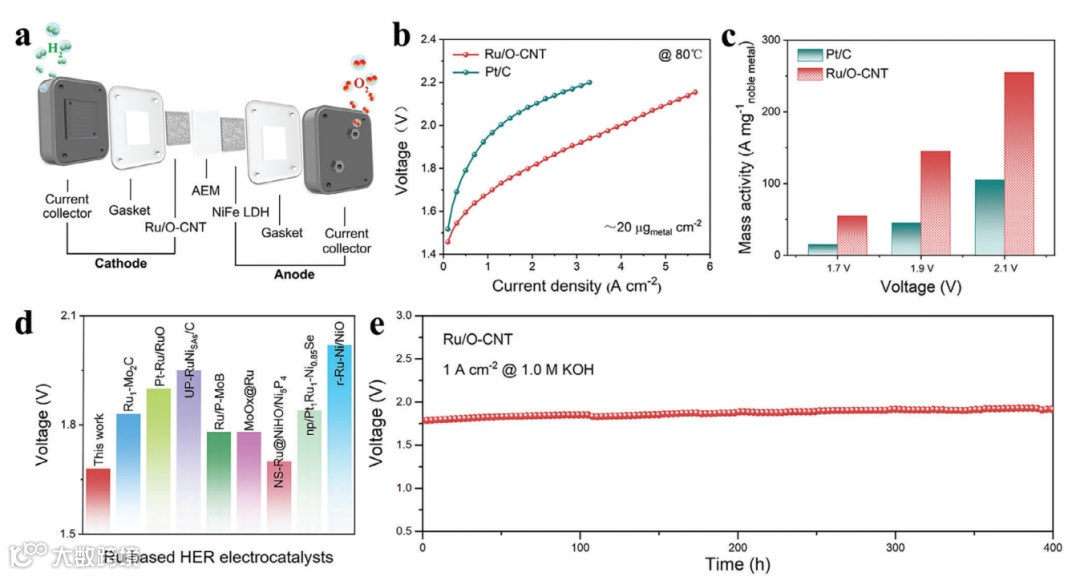 图6:AEMWE性能测试,展示了Ru/O-CNT基AEMWE的低电池电压和长期稳定性。