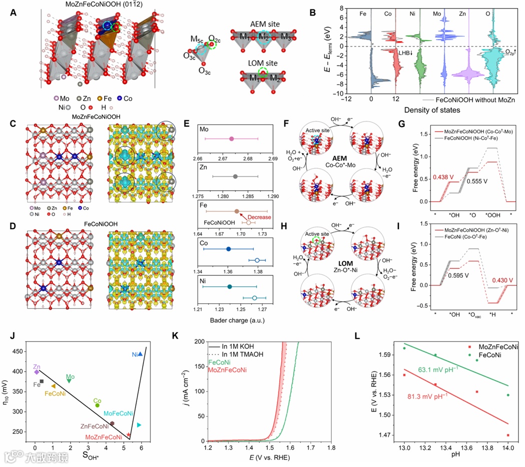 图5展示了针对MoZnFeCoNiOOH的详细DFT分析结果,包括活性位点的结构特性、电子态分布以及OER机理。