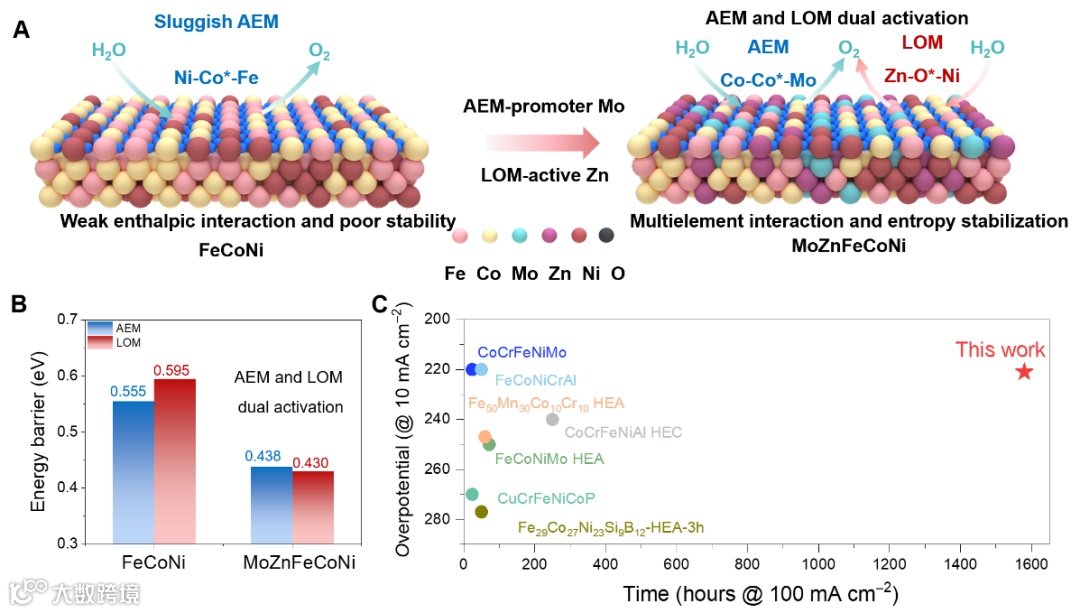 图1:OER中双活化设计:研究验证了MoZn基HEA在AEM和LOM机制中的出色表现。
