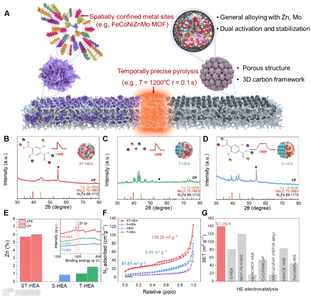 研究团队提出了一种创新的MoZnFeCoNi高熵合金(HEA),通过整合AEM促进剂Mo和LOM活性Zn,实现了OER的双重活化与稳定。针对Mo和Zn在高温下的氧化及Zn挥发性问题,团队设计了结合空间受限前驱体和1200°C/0.1秒热冲击热解的合成方法。这一策略不仅避免了元素挥发,还保留了多孔结构特性。研究表明,该催化剂在10 mA cm²时的过电位仅为221 mV,并在100 mA cm²的高电流密度下稳定运行超过1500小时。论文以“MoZn-based high entropy alloy catalysts enabled dual activation and stabilization in alkaline oxygen evolution”为题发表于《Science Advances》。
