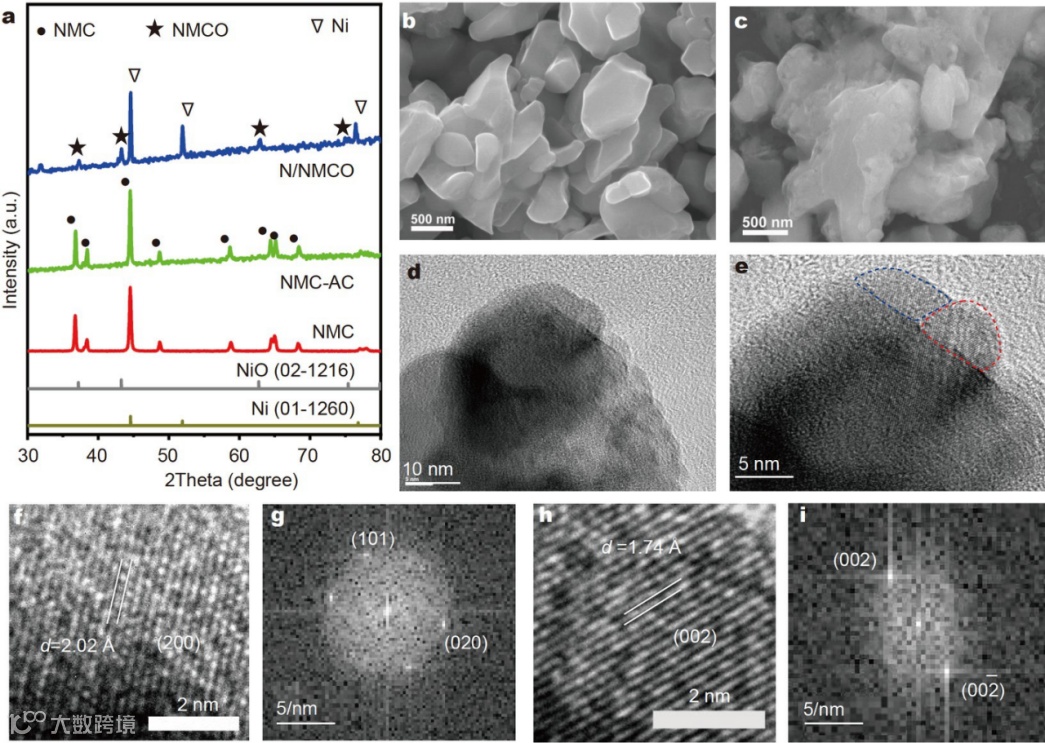 HRTEM图像和SAED图案:提供了NMCO和Ni纳米颗粒的高分辨率TEM图像和选区电子衍射图案,证实了N/NMCO复合材料中同时存在金属Ni和多种过渡金属氧化物。