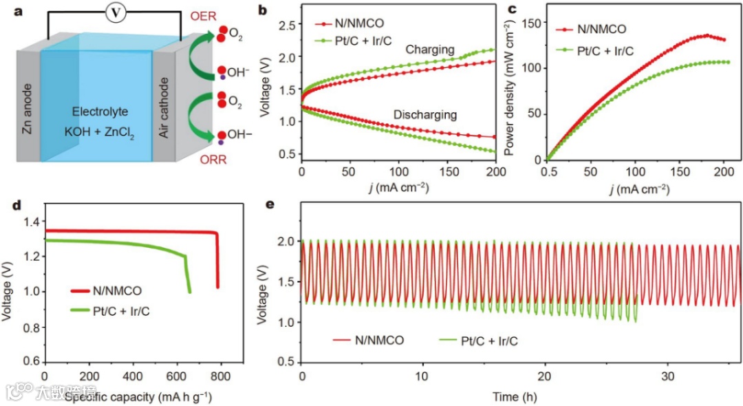 ZAB示意图:展示了以N/NMCO作为正极,锌板作为负极的ZAB示意图。