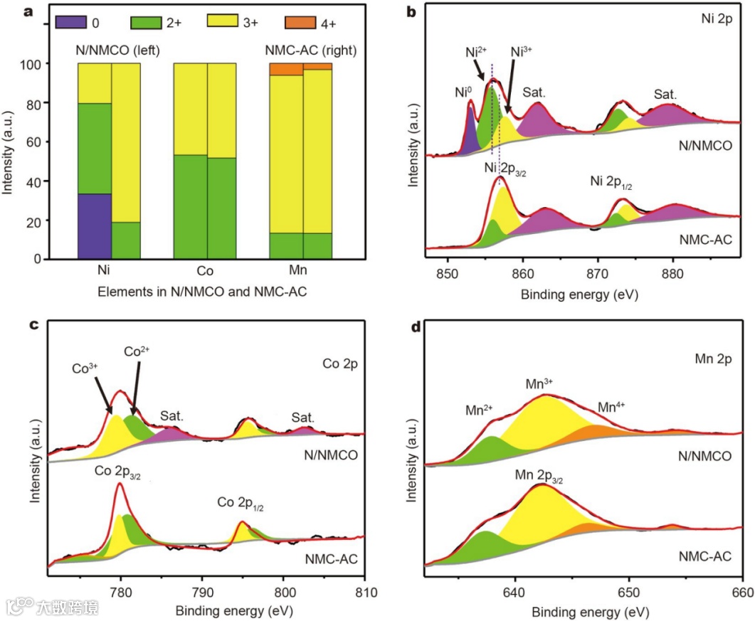 价态分析:展示了Ni、Co和Mn在N/NMCO和NMC-AC中的不同价态比例,其中N/NMCO中Ni的平均价态低于NMC-AC,且Ni²⁺的比例增加。