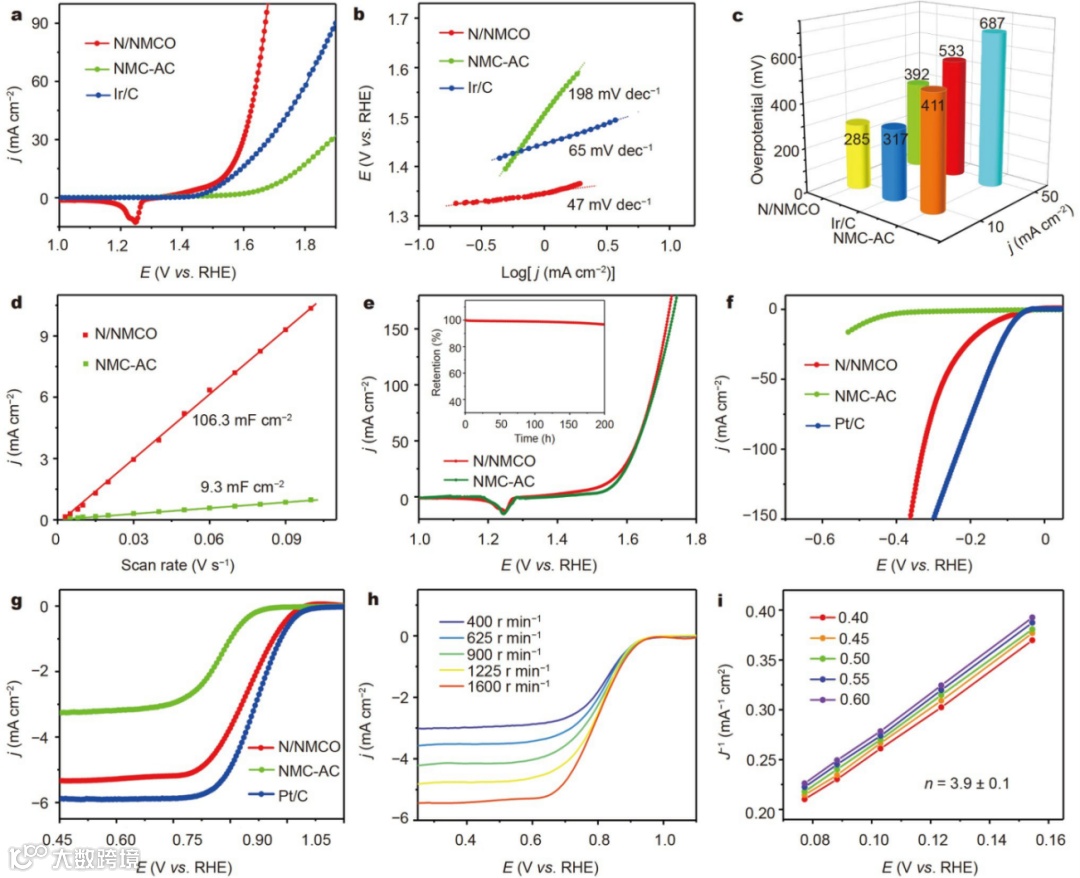 Tafel曲线和过电位:进一步证实了N/NMCO的优异OER性能。