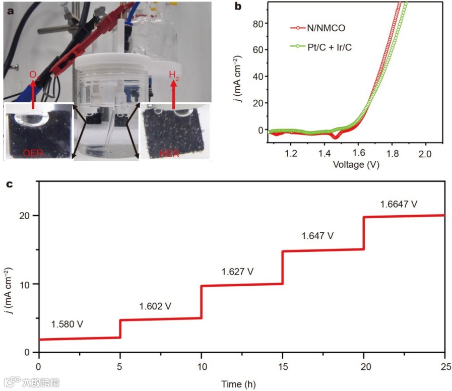 装置照片:展示了以N/NMCO作为阴阳极的整体水分解装置的照片。