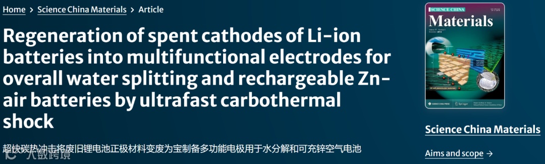 创新回收技术:天津大学的研究团队提出了一种超快碳热冲击(CTS)技术,用于将废旧锂离子电池正极材料(LiNi0.8Mn0.1Co0.1O2)转化为具有优异电催化性能的多功能电极材料(Ni/Ni-Mn-Co-O复合材料)。