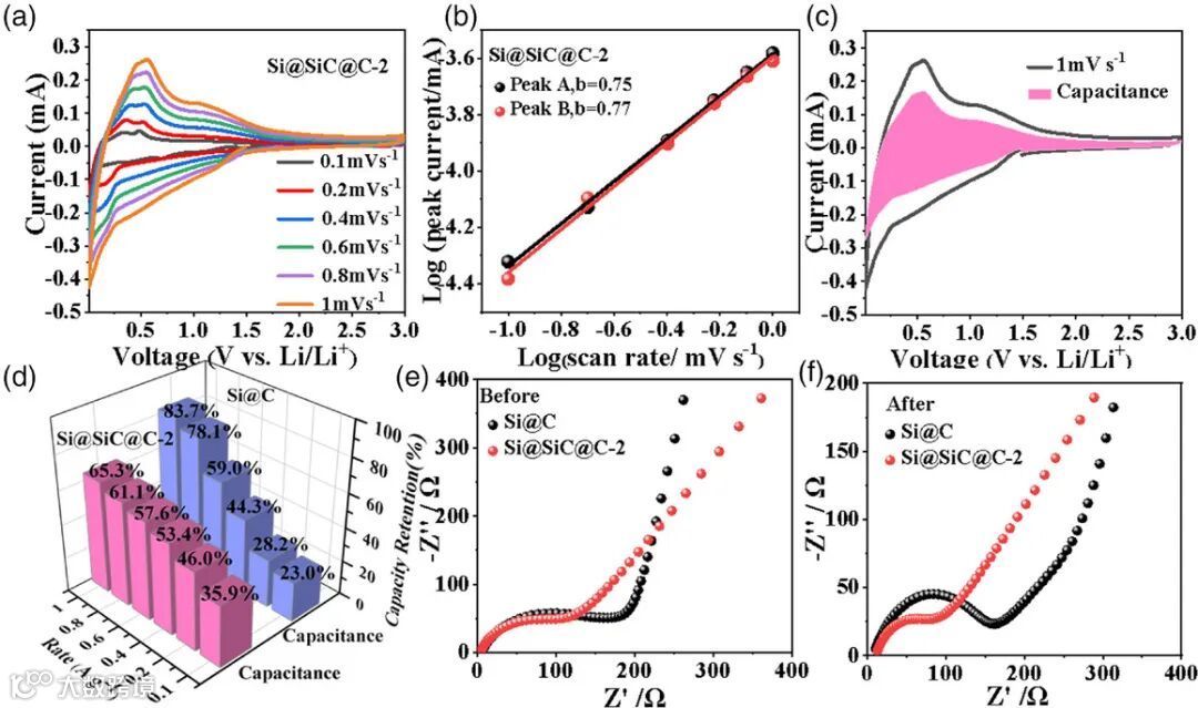 图 6 通过 CV(a)和 EIS(e-f)分析了储锂机制与界面动力学。CV 曲线显示,随着扫描速率增加,赝电容贡献占比从 35.9%(0.1 mV/s)升至 65.3%(1 mV/s),表明表面驱动的快速反应占主导(c-d)。EIS 谱中,Si@SiC@C-2 的电荷转移阻抗(88 Ω)显著低于 Si@C(162 Ω),归因于 SiC 层与碳纤维协同提升的离子 / 电子传导性(e-f),为其高倍率性能提供了理论支持。