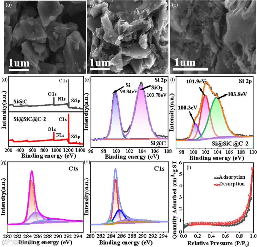 图 3 通过 SEM(a-c)和 XPS(d-h)分析了材料的形貌与表面化学状态。SEM 显示,原始硅表面光滑(a),而 Si@C(b)和 Si@SiC@C(c)表面因碳包覆呈现褶皱,后者还生成导电碳纤维。XPS 谱中,Si@SiC@C-2 的 Si 2p 谱在 101.9 eV 处出现 Si-C 键峰(e),C 1s 谱中 283.8 eV 的 C-Si 键(h)进一步证实 SiC 层的存在。BET 测试(i)表明,Si@SiC@C-2 的低比表面积(<10 m²/g)减少了电解液副反应,同时具备高压实密度(~1.5 g/cm³)。