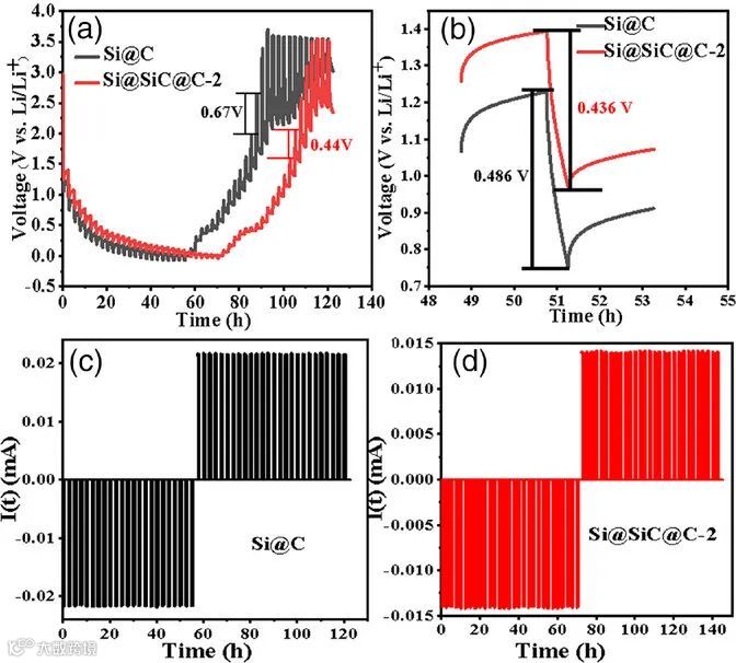 图 7 通过恒电流间歇滴定(GITT)量化了锂离子扩散速率。Si@SiC@C-2 的极化电压(0.44 V)仅为 Si@C(0.67 V)的 65%(a-b),且锂离子扩散系数(D₀≈1.2×10⁻¹⁰ cm²/s)提高 3 倍(c-d),证实其优异的动力学性能,这得益于 SiC 层对体积膨胀的抑制和碳层的高导电性