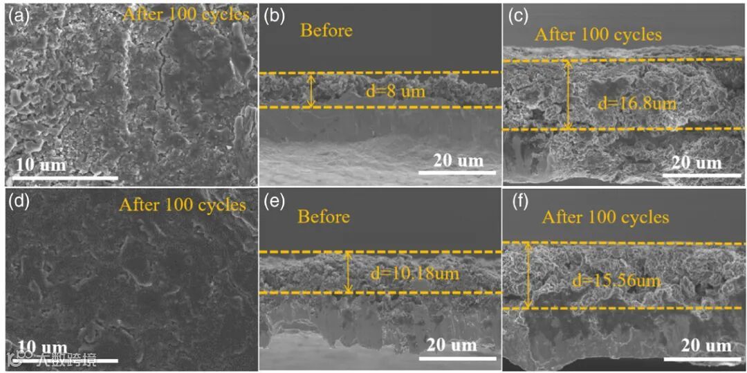 图 8 通过循环前后的 SEM 对比(a-f),直观展示了 Si@SiC@C-2 的结构稳定性。循环 100 次后,Si@C 电极因体积膨胀(110%)出现严重裂纹(a-c),而 Si@SiC@C-2 仅膨胀 52.8%(d-f),表面形貌基本完整。这一结果直接证明了 SiC 层作为刚性缓冲层的有效性,为硅负极的商业化应用提供了关键解决方案。