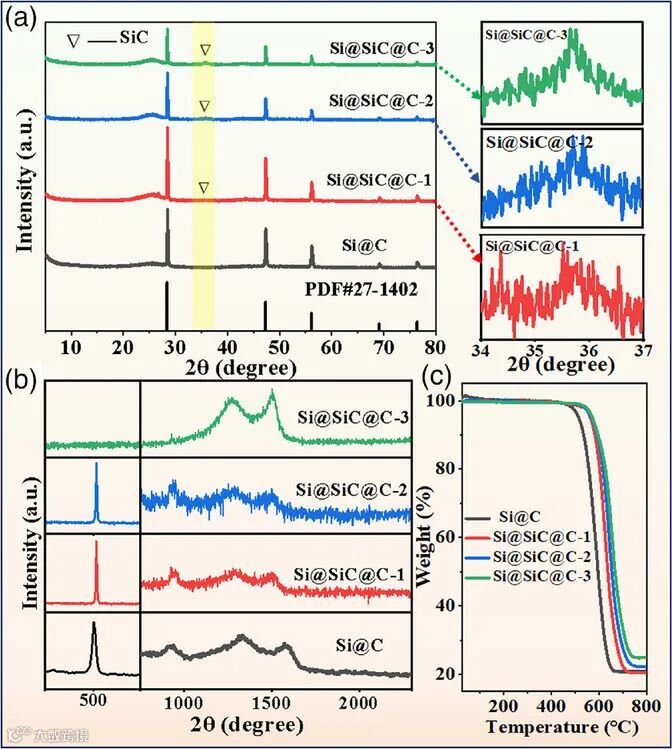 图 2 通过 XRD(a)、Raman(b)和热重分析(c)揭示了材料的结构与组分演变。XRD 谱显示,随着合成温度升高(Si@SiC@C-1 至 Si@SiC@C-3),35.6°、60° 及 72° 处逐渐出现 SiC 的特征峰,证实 SiC 层的可控生成。Raman 谱中 ID/IG 比值从 1.15(Si@C)降至 0.93(Si@SiC@C-3),表明高温促进了碳层的石墨化,提升导电性。热重分析显示,Si@SiC@C 的初始分解温度(530°C)显著高于 Si@C(470°C),且碳含量随 SiC 层增厚逐步降低,验证了材料的热稳定性。