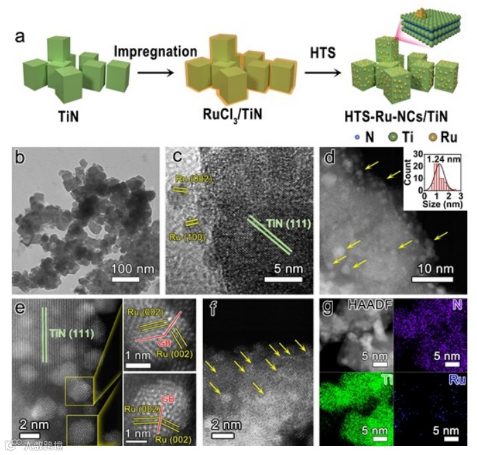 图1. a) HTS-Ru-NCs/TiN的合成示意图;b) HTS-Ru-NCs/TiN的TEM图像和 c) HR-TEM图像;d-f) HTS-Ru-NCs/TiN的HAADF-STEM图像和 g) EDX元素映射图谱。