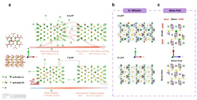 图1展示了非平衡(H-LFP)和平衡(F-LFP)煅烧中Li+的扩散,H-LFP中Li+的二维扩散通道和F-LFP中的一维扩散通道,以及应变场分布的示意图。