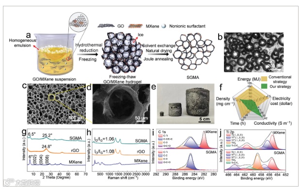 研究提出了一种创新的自然干燥方法,结合了快速焦耳热退火技术,成功实现了大规模生产高灵敏度定制传感器的MXene基复合气凝胶。通过在30秒内将温度迅速提升至450℃的flash Joule退火处理,不仅去除了气凝胶中的额外氢和氧物种,还修复了还原石墨烯(rGO)和MXene片层之间的交联缺陷,从而获得了具有更紧凑结构的高性能气凝胶。这种处理方式不仅成本低廉,而且易于操作,有助于生产超轻的MXene基气凝胶,具有任意宏观尺寸和出色的机械性能。此外,通过精确控制孔隙结构和表面化学,所制备的气凝胶展现出了优异的压缩弹性和电响应性,使其在传感器技术中具有广泛的应用潜力,包括对从轻质纸张到人体运动等各种压力信号的高灵敏度监测。该方法作为一种可扩展的大规模生产具有多种应用的气凝胶的方法,具有重要的应用前景。