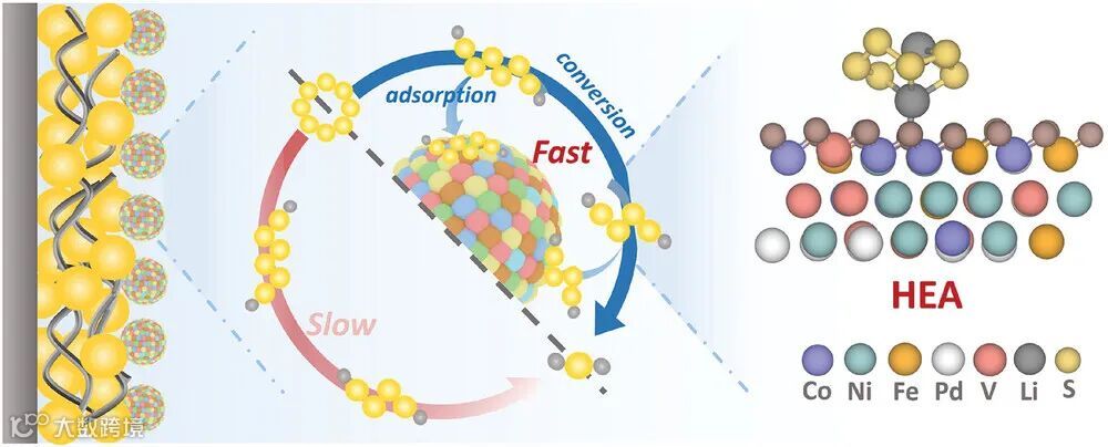 采用了高熵合金(HEA)纳米催化剂来加速锂硫(Li-S)电池中的逐步硫氧化还原反应。通过在传统的过渡金属合金CoNiFe中引入钒(V)和钯(Pd)元素,研究人员利用超快焦耳加热合成技术在碳纳米纤维(CNFs)上成功制备了CoNiFePdV高熵合金。V和Pd的加入显著提升了HEA的结构特性和电化学活性,特别是钒在HEA催化剂中显著增加了活性位点,并且与钯的协同作用显著提高了对LiPSs的吸附和催化能力,从而减少了活性硫材料的损失。原位拉曼分析结合密度泛函理论(DFT)计算证实了HEA与LiPSs之间的相互作用,有效抑制了LiPSs的溶解,进而抑制了穿梭效应(如图1所示)。结果表明,基于HEA的电池展现出高达1364 mAh g^-1的显著比容量,以及卓越的循环稳定性和倍率性能。CoNiFePdV高熵合金在Li-S电池改性中的应用验证了高熵催化的可行性,并为高熵催化剂的设计提供了范例,突显了其在推动高性能电池发展中的潜力。