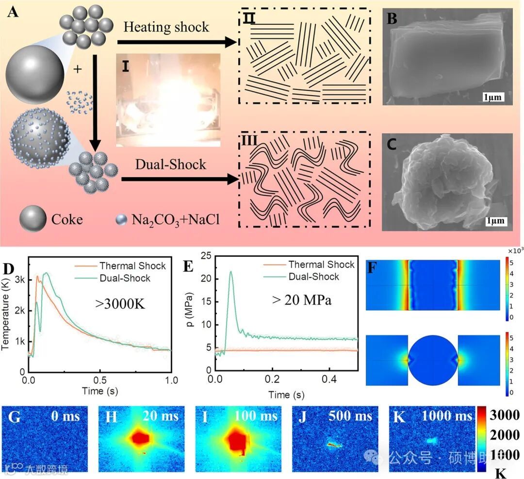 研究开发了一种新颖的双冲击化学策略,用于合成碳负极材料。该策略包括两个关键步骤:首先,利用高达3228 K的超高温进行热冲击,从热力学角度促进石墨化过程;其次,通过21.64 MPa的机械冲击破坏碳分子中芳香环的π-π相互作用,从而得到由晶态和非晶态碳组成的混合结构碳。优化后的碳材料(DSC-200–0.3)在10C的高倍率下展现出208.61 mAh/g的容量,相比原始石墨的15 mAh/g有显著提升。更令人印象深刻的是,经过3000个充放电循环后,该材料仍能保持81.06%的容量。动态过程分析显示,这种卓越的速率性能归功于更大的层间距,有利于离子传输,无序的非晶碳提供了额外的锂存储位点,而晶态碳则增强了电荷转移。双冲击化学方法为快速生产混合结构碳负极提供了一种成本效益高且效率高的途径,使锂离子电池具备了10C的快速充电能力,为高性能能源存储系统的发展开辟了新的方向。