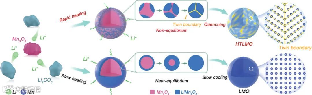 研究提出了一种超快高温冲击技术(High-Temperature Shock, HTS),通过极速加热和冷却过程,在数秒内成功引入双晶界(Twin Boundaries, TBs)至尖晶石结构的LiMn2O4中。与传统合成方法相比,HTS技术不仅简化了工艺,还显著提升了材料的电化学性能。研究发现,引入TBs的LiMn2O4展现出更高的速率性能和循环稳定性。此外,通过HTS技术,研究者们还在数秒内均匀掺杂了异质元素(如Ni2+),进一步改善了材料的循环性能。这项研究不仅为尖晶石结构电极材料的改性提供了新思路,也为开发高性能锂离子电池开辟了新途径。通过非平衡技术设计缺陷,可以显著提升电极材料的电化学性能,这对于推动清洁能源技术的发展具有重要意义。