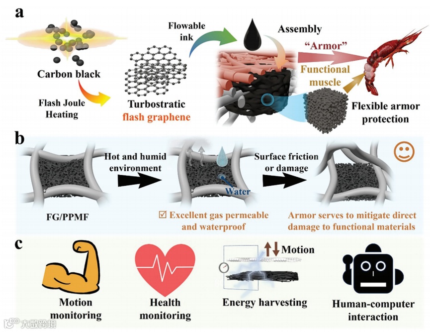 研究开发了一种基于闪蒸石墨烯(Flash Graphene,FG)的具有仿生装甲设计的柔性电极材料(FG/PPMF)。这种电极材料在人体生理信号监测(ECG和EMG)、人体运动检测及人机交互领域均展现出了良好的性能,为柔性电子传感的研究做出了重要贡献。在实验过程中,研究团队成功利用中科精研FJH焦耳闪蒸加热装置,以石墨粉为原料,在几微秒内实现了3000K以上的超高温快速加热,制备出具有丰富的纳米级孔隙结构导电墨。随后,利用这种导电墨成功开发出了一种新型柔性电极。该电极不仅具有极佳的导电性和透气性,而且机械强度优异。