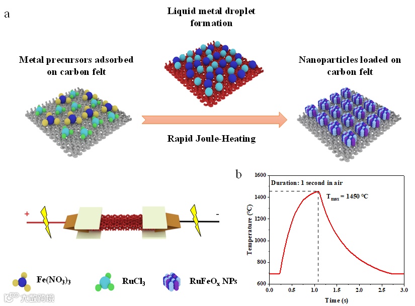 图1:RuFe@CF催化剂的制备过程。(a)快速焦耳加热技术制备RuFe@CF催化剂的过程;(b)加热时间1 s内的时间-温度关系图。
