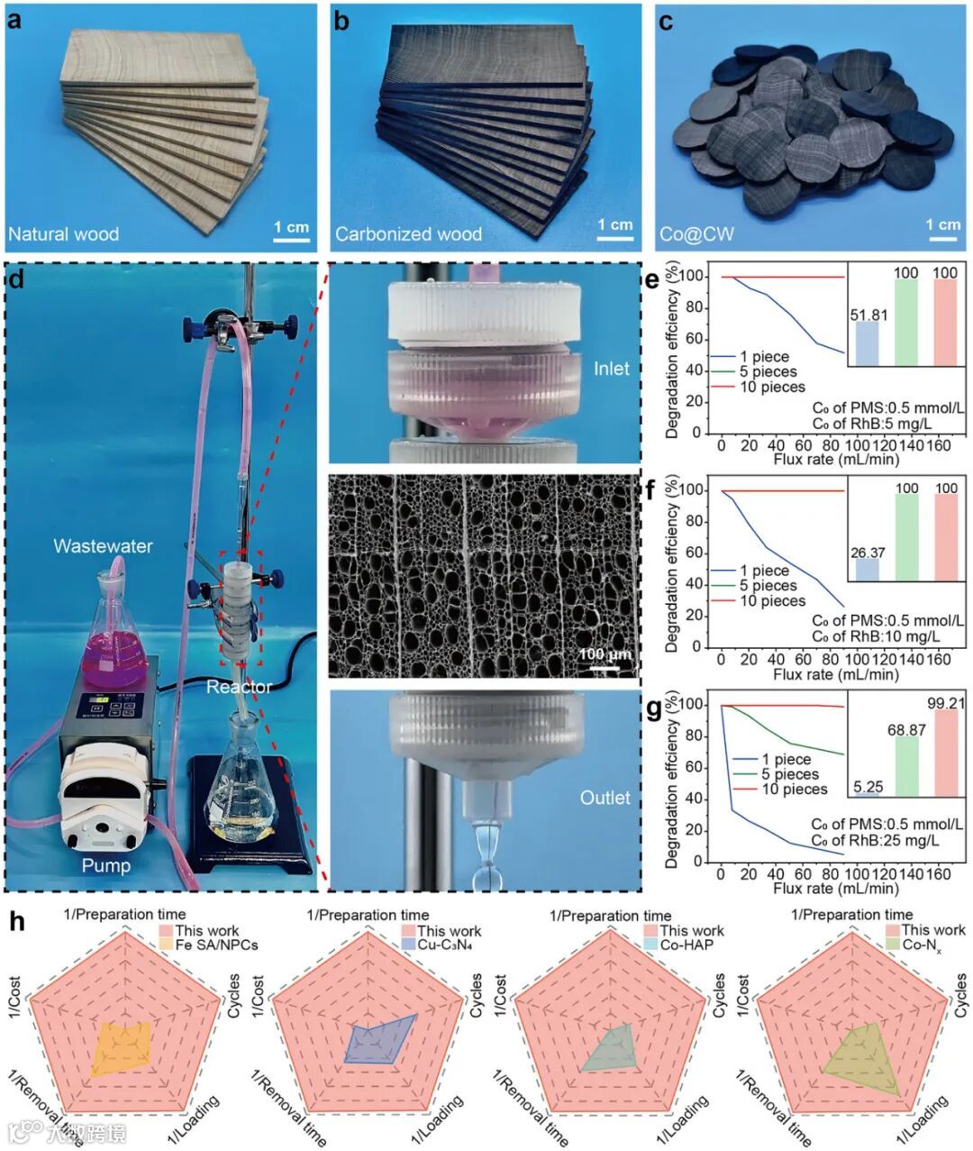 图5:评估了基于Co@CW-1000 K的连续过滤装置在水处理中的应用潜力。连续过滤实验表明,Co@CW-1000 K在模拟实际水处理中表现出良好的动态降解能力。