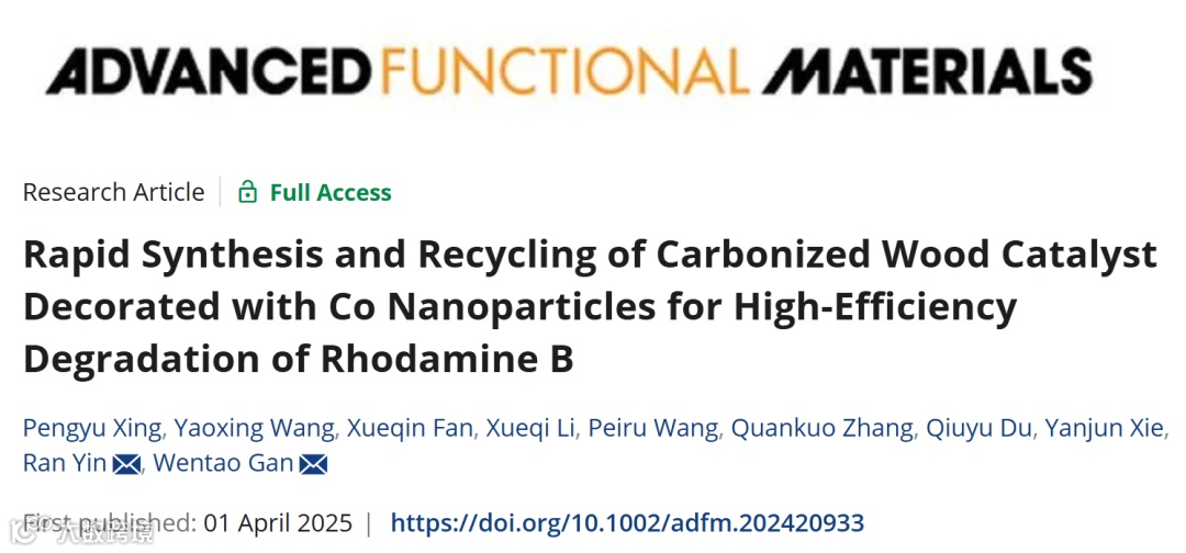 创新制备方法:开发了一种基于高温热冲击(HTS)技术的快速制备方法,通过在碳化木表面原位生成钴纳米颗粒(Co@CW),成功制备了一种高效、稳定且可循环利用的催化剂。