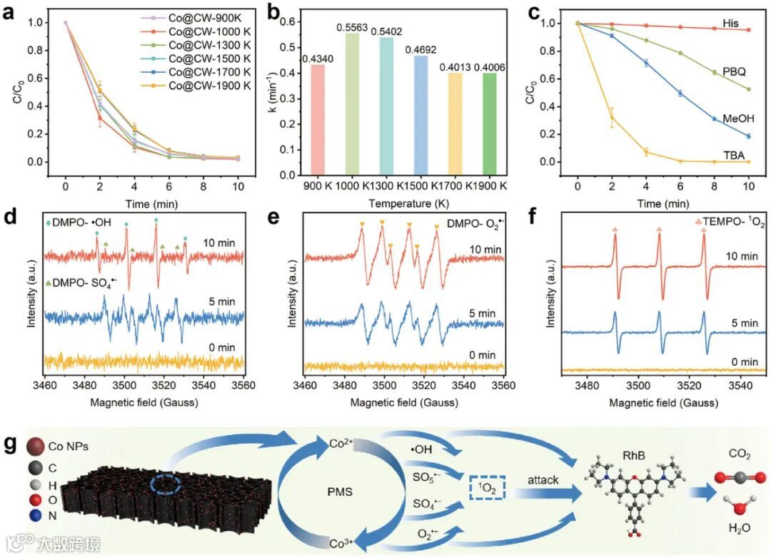 图3:展示了Co@CW-1000 K在过氧单硫酸盐(PMS)激活降解亚甲基蓝(RhB)中的性能和机制。Co@CW-1000 K在10分钟内实现了99%的RhB去除率,表现出最高的催化活性。