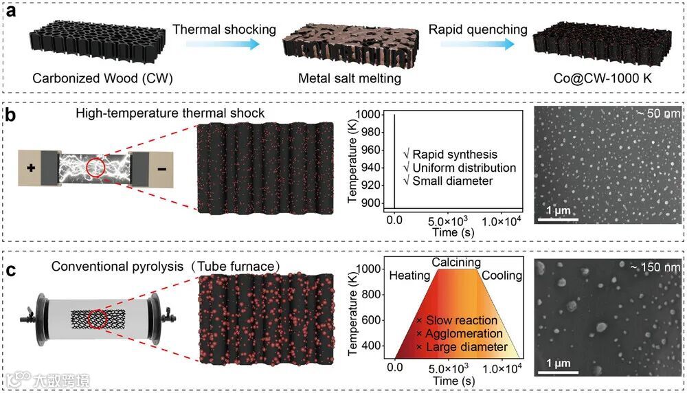 图1:展示了通过高温热冲击(HTS)方法在碳化木(CW)表面原位生成钴纳米颗粒(Co NPs)的制备过程。HTS技术在1000 K下仅需2秒即可完成催化剂的制备,显著减少了时间和能源消耗。