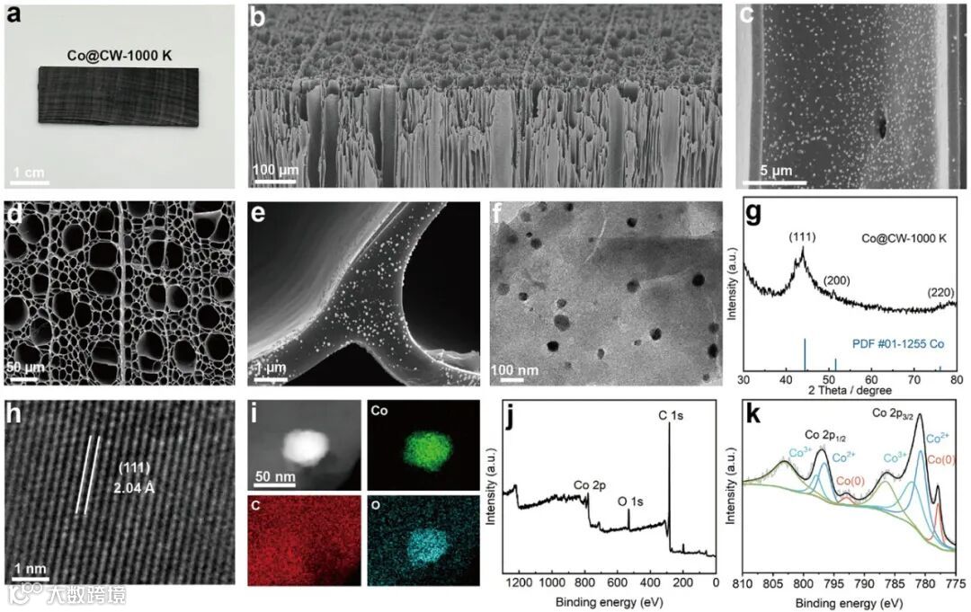 图2:对Co@CW-1000 K的形貌和结构进行了详细表征。SEM和TEM图像显示了其规则的多孔结构和有序的木通道,确认了Co NPs在整个CW通道中的完全覆盖。