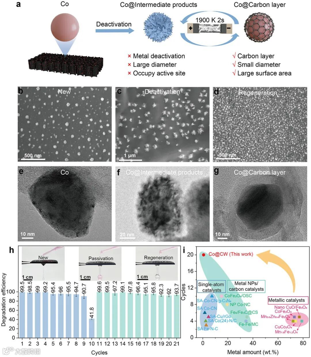 图4:展示了Co@CW-1000 K催化剂的失活和再生过程。通过1900 K的HTS处理将失活催化剂表面的降解中间体转化为石墨碳层,从而恢复催化剂活性。