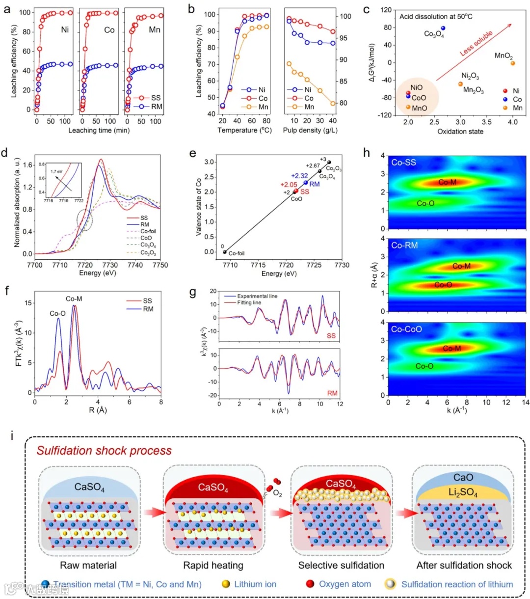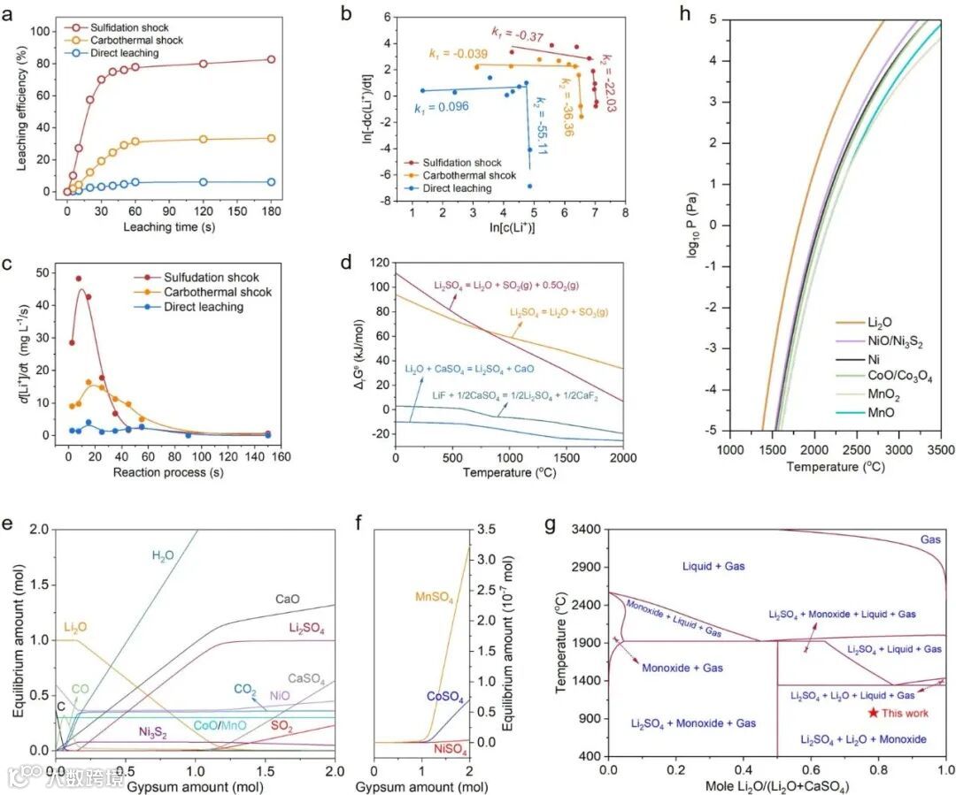 浸出动力学与选择性硫化热力学 图2展示了SS产物的水浸出动力学,其中图2a展示了浸出时间对锂浸出效率的影响,SS方法在短时间内便达到了较高的浸出率,而传统方法仍然需要较长时间。图2b进一步揭示了Li₂SO₄的高溶解度在浸出过程中的促进作用。 图2d、2e-f展示了硫化冲击过程的热力学分析,明确了锂组分的硫化反应能够自发进行,并且通过石膏的加入优化了反应产物。