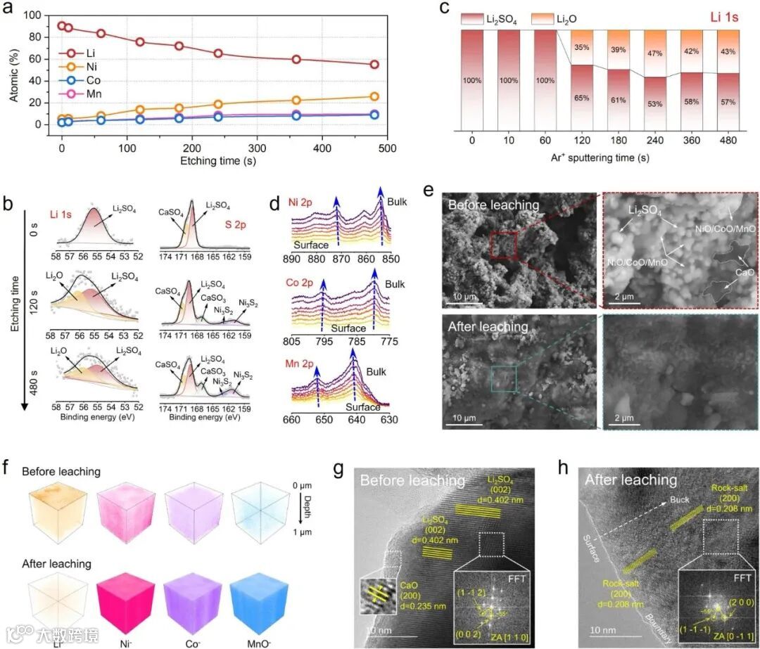 锂的硫化富集机制 图3展示了XPS分析在锂迁移过程中的应用,图3a、3b展示了锂从颗粒内部迁移至表面,并形成Li₂SO₄层的过程。通过XPS刻蚀时间的变化,研究表明锂的迁移过程与硫化反应的配合能够提高锂回收效率。
