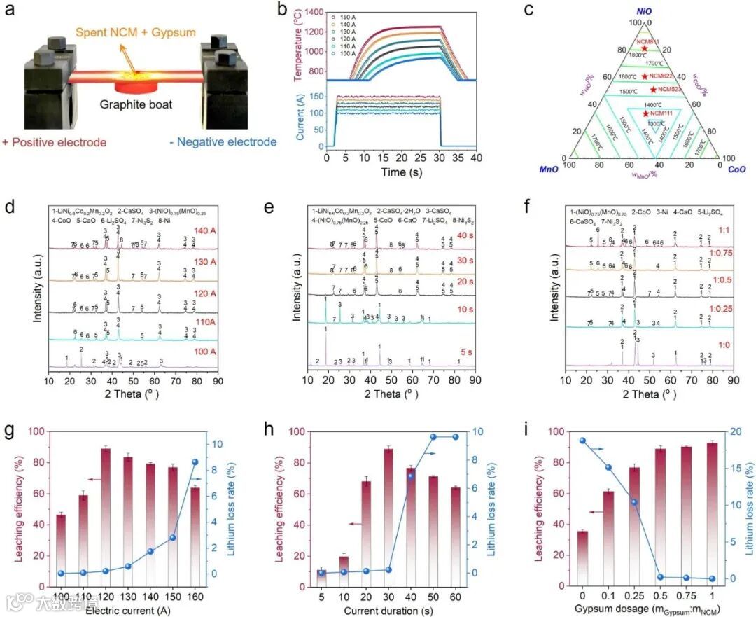 锂的预提取过程与电加热条件 图1展示了SS过程的电加热条件与设备结构,图1a是SS过程的示意图,清晰呈现了实验装置的构造及工作原理。图1b则显示了在不同电流条件下的温度测量结果,通过调整脉冲电流的强度和持续时间,电流可以迅速将温度从常温升至1000°C,比传统管式炉的升温速率快200到800倍。 图1c、1d-f展现了不同电流强度、持续时间和石膏用量下硫化产物的XRD图谱,进一步分析了Li₂SO₄的形成过程。图1g-i则展示了优化条件下锂浸出率和热损失率的变化,说明了石膏加入的作用,成功减少了锂的热挥发损失。