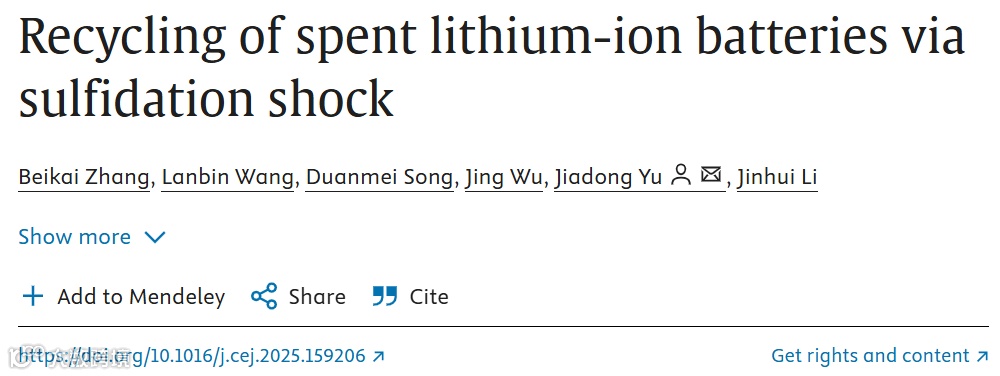 2025年1月4日,清华大学李金惠教授和余嘉栋博士团队在《Chemical Engineering Journal》期刊上发表了名为《Recycling of spent lithium-ion batteries via sulfidation shock》的研究论文。该研究创新性地提出了选择性硫化冲击(SS)策略,利用脉冲直流电产生瞬时高温,在废旧锂离子电池中高效回收锂金属。此方法不仅避免了高能耗和有害气体排放的传统问题,还能显著提升锂回收效率,对推动电池回收技术的绿色环保发展具有重要意义。