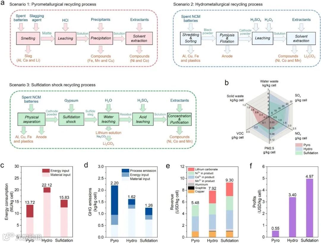 环境经济与可扩展性分析 图5展示了三种回收方案的对比分析,包括热冶金、湿法冶金和SS过程。结果表明,SS过程在能源消耗、排放和经济效益方面均优于传统方法,具有明显的环境友好性和可扩展性。