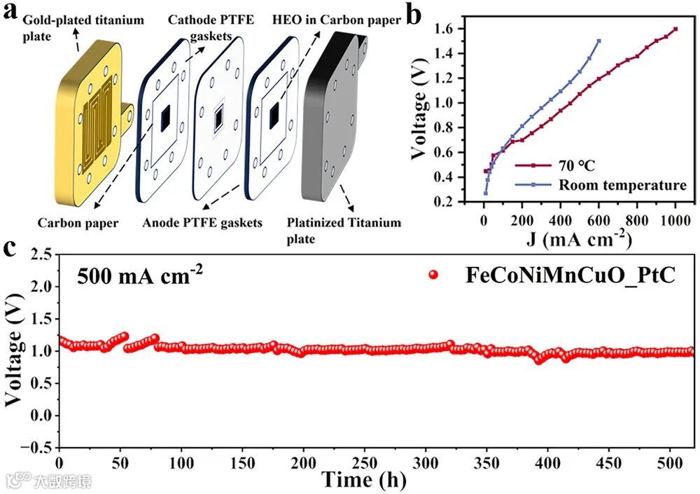 非对称电解槽中,FeCoNiMnCuO 阳极与 Pt/C 阴极构成体系。70°C 时达到 500 mA/cm² 仅需 1.07 V,对应制氢能耗 2.4 kWh/m³ H₂。500 小时持续运行电压波动 < 3%,规避氯析出反应和碳载体氧化问题,为海洋氢能开发提供新方案。