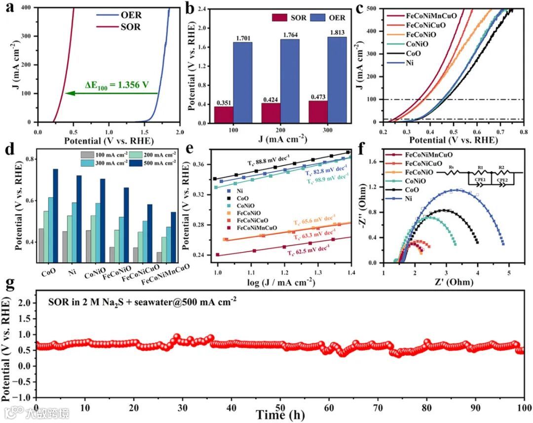 FeCoNiMnCuO 在含 2.0 M Na₂S 海水中达到 100 mA/cm² 仅需 0.351 V_RHE,较 OER 节能 1.35 V;500 mA/cm² 过电位(0.545 V_RHE)显著低于中熵材料。Tafel 斜率与最小电荷转移电阻证实其优异动力学,100 小时稳定性测试验证抗腐蚀性。高熵效应增强活性位点暴露与界面电荷传输,是性能提升的关键。