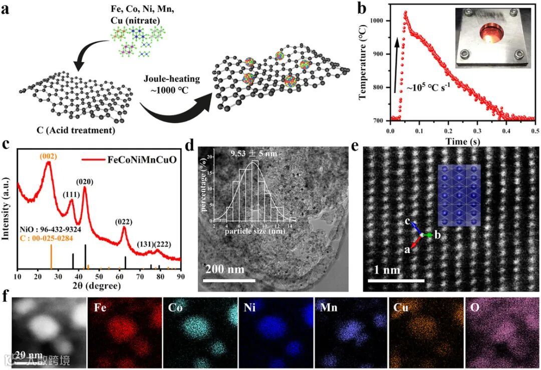 创新合成工艺 :利用焦耳热冲击法(50 ms 脉冲)实现碳载五元高熵氧化物催化剂的快速制备,突破传统工艺限制,精准调控纳米颗粒尺寸与结构。