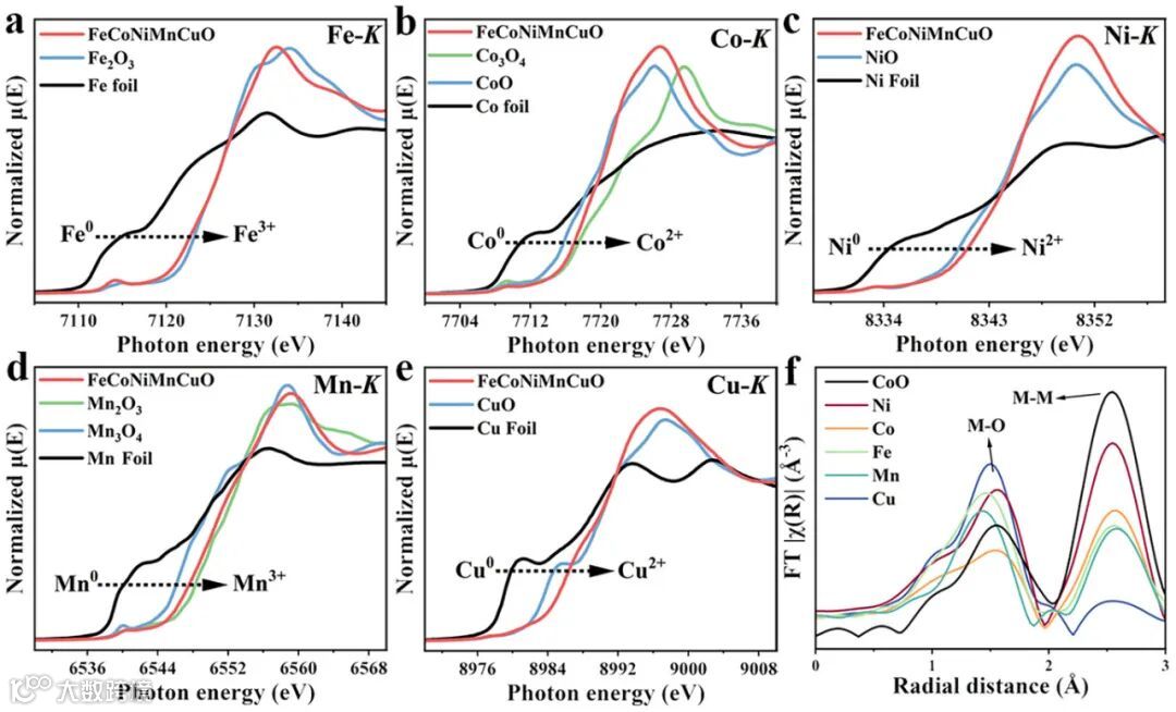 同步辐射 XAS 解析高熵氧化物的电子结构。K 边 XANES 表明 Fe(+3)、Co(+2)、Ni(+2)、Mn(+3)、Cu(+2)价态分别匹配相应标准物,但吸收边形状差异揭示多元素电子耦合效应。FT-EXAFS 显示所有金属元素 M-M 配位路径长度相近,证实岩盐结构中原子级混合。Cu 的弱 M-M 散射强度表明其倾向占据表面缺陷位,为硫吸附提供活性中心。