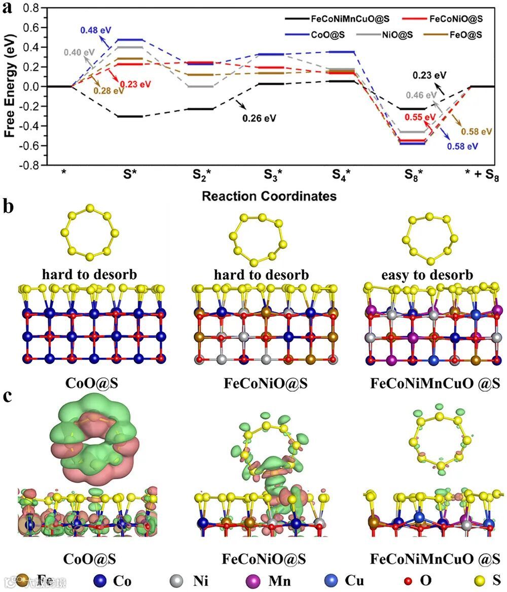 高熵效应优势 :高熵效应通过稳定电荷分布,显著降低决速步(S₈ 脱附)能垒,优化反应路径,提升催化效率与稳定性。