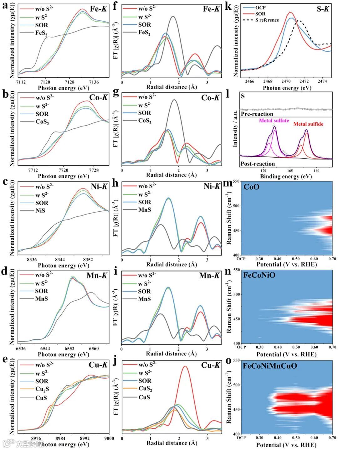 操作 XAS 捕捉硫化物活性相原位形成。开路电位下,Cu 优先硫化,Fe/Co/Ni 部分转化,Mn 保持惰性;施加 0.55 V_RHE 后,Cu₂S→CuS 转化且 Fe 氧化态升高。硫 K 边 XAS 显示硫化物特征峰及多硫化物肩峰,XPS 证实反应后金属 - 硫键与硫酸盐共存。原位拉曼光谱揭示高熵催化剂在低电压触发 S²⁻ 和 S₃²⁻/S₄²⁻ 信号,强度较单金属催化剂大幅提升。