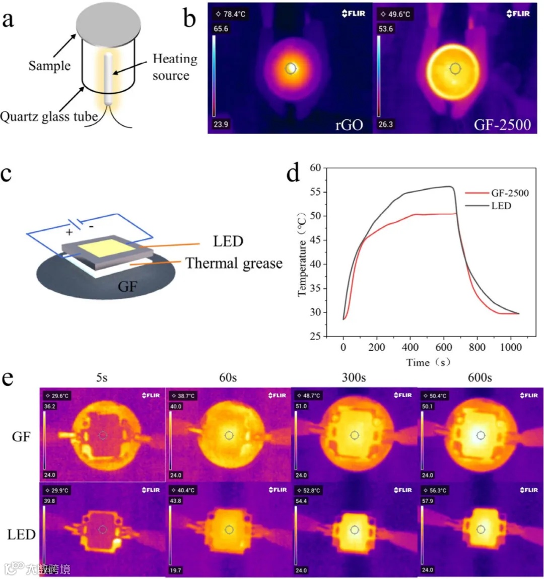 为了比较GF的热扩散效应,研究人员使用LED加热棒加热薄膜中心,并调整加热功率,使得当LED加热棒达到160°C时,薄膜直接放置在加热棒上方5毫米处。**图4(a)**展示了测试装置的示意图。使用红外相机记录了薄膜中心的加热温度,直到温度变化稳定,并比较了rGO和GF-2500的平均温度性能。与rGO相比,GF-2500的中心温度降低了28.8°C,且整体表面温度分布更加均匀。为了验证GF-2500的散热能力,研究人员在LED灯背面涂上热导硅胶,并贴上直径为20毫米的GF-2500。在相同的功率条件下记录了LED灯的表面温度,**图4(c)**展示了测试装置的示意图。**图4(d)展示了LED散热温度曲线。测试结果表明,10分钟后,没有GF热膜的LED灯泡表面温度下降了6°C。相反,使用GF-2500的LED散热更快,从50.6°C降至室温的时间缩短了42.8%。这一结论得到了图4(e)**中红外图像的支持。这些结果表明,GF可以有效地降低高热生成电子组件的工作温度,并且通过增加GF的面积,可以进一步增强散热效率。