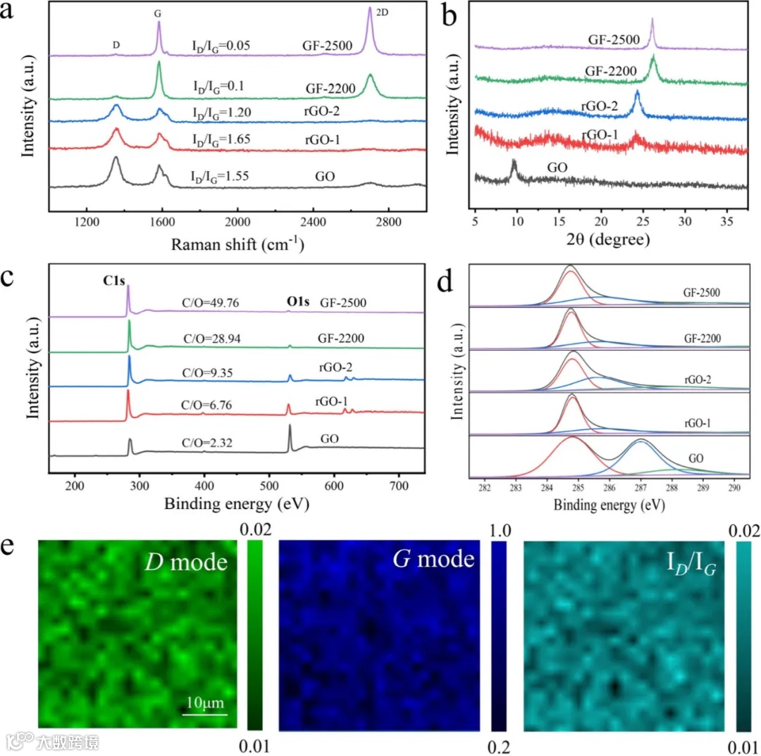 为了深入研究快速高温还原技术对GF内部结构的影响,研究人员对rGO及其得到的石墨烯薄膜(GF)进行了X射线光电子能谱(XPS)和拉曼光谱测试。**图3(a)**中的拉曼光谱结果显示,通过高温快速还原得到的GF-2500在缺陷峰(D峰,1350 cm−1)的强度显著降低,而在石墨烯晶格的G峰(1580 cm−1)的强度增加。GF-2200和GF-2500的D峰与G峰强度比(ID/IG)分别为0.1和0.05,表明快速高温还原有效地修复了石墨烯的缺陷。值得注意的是,GF-2500的2D峰(2680 cm−1)的强度超过了G峰,这表明快速高温还原仍然能够产生稳定的石墨烯层状堆叠结构。为了评估GF-2500的内部均匀性,研究人员使用了拉曼映射技术观察D峰、G峰和ID/IG的归一化,结果显示在微米级别上具有均匀的内部结构。