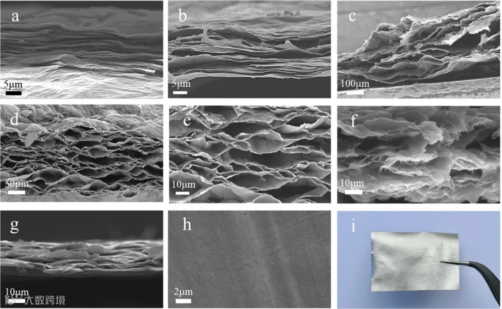 图2中的扫描电子显微镜(SEM)图像进一步揭示了还原过程中石墨烯薄膜的微观结构变化。研究人员观察到,经过室温下的HI化学还原,rGO-1薄膜的层间距增加,厚度扩展到20-25微米。而在160°C的水热处理下,rGO-2薄膜的层间间隙进一步增大,厚度增加到300-350微米,形成了连续的剥离和通道。这些通道对于焦耳热处理过程中的快速气体逸出至关重要。滚压后的石墨烯薄膜(GF)显示出紧凑有序的内部结构,厚度减少到18-22微米,与初始GO薄膜的厚度相近。这些结果表明,两步HI还原过程有效地减轻了气体释放造成的结构损伤,促进了快速气体排出,降低了热阻,并增加了GF的密度。